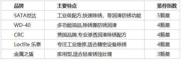 以下是市面上几款主流除锈剂品牌推荐,方便对比选择: